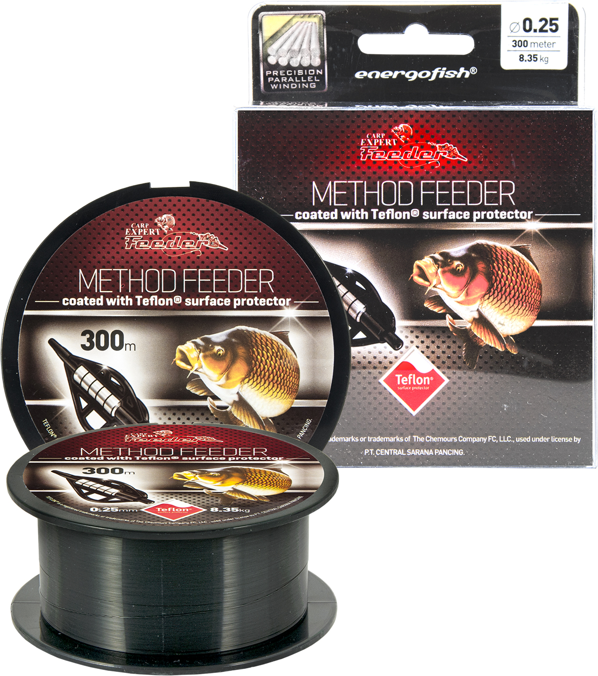 V rámci feederového lovu je jednou snad nejoblíbenější metodou method feeder. Mnoho rybářů tento způsob používá na vysoké úrovni, musí se i vlasce přizpůsobit navýšením nárokem. Jeden dobrý method feeder musí být potřebně silná, protože nejčastější je cílovou rybou kapr. Kapři nebývají velkých rozměrů, ale často se na háček dostanou při této metodě i kapitální kapři, klidně i 20 kilogramové. Nemluvíme o divoce se bránících amurech, které jsou známí přetrháváním vlasců v blízkosti břehů. Musí disponovat minimální průtažností, protože ne vždy jsou náhozy nad 100 metrů, kdy při vlasci s větší průtažností projde množství času, než pocítíme záběr. Průtažnost u klasického monofilového vlasce je 10%, co znamená, že 100 metrů nahozeného vlasce se dokáže natáhnout o 10 metrů! Jestli si představíme, že jestli ryba potáhne vlasec o 10 cm, tak při této průtažnosti na břehu nepostřehneme vůbec nic. Proti tomu průtažnost vlasce Carp Expert Method Feeder je pod 5%, takže můžeme rychle vypočítat, že dvojnásobně rychleji postřehneme záběry. Jestli se ryby krmí opatrně, je málo záběrů, jen tato vlastnost nám může napomoct k tomu, abychom nešli domů s prázdnými rukami. Měkčí vlasec se odvíjí z cívky mnohem snadněji, díky čemu s nimi dokážeme nahodit do větších vzdáleností. Mimochodem, lépe se s nimi pracuje z hlediska vytváření systémů a spojování. A nyní jsme se dostali k druhé nejdůležitější extra složce, teflonový potah. Ten je pro nás důležitý, protože vytváří mikro vrstvu na povrchu vlasce, díky klouzavému charakteru mnohem lépe proklouzne přes očka prutu, méně se bude náš vlasec opotřebovávat, čím se zvyšuje jeho životnost. A už vůbec se nemusíme bát toho, že by se naše spoje rozdělily.