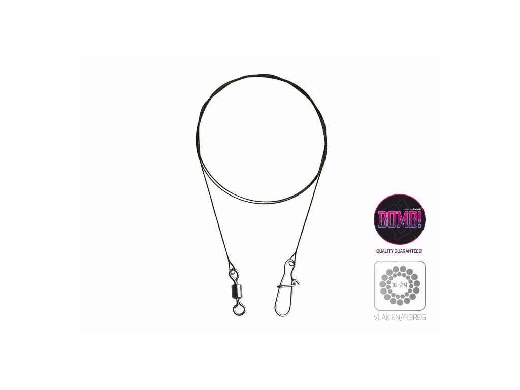 Na jedné straně wolframového lanka BOMB! se nachází obratlík a na druhé karabinka, které jsou uložené ve smyčkách. V každém balení se nachází až 2 kusy tohoto odolného lanka!